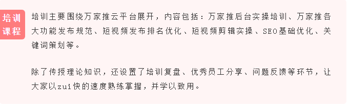 此次培訓(xùn),從理論到實(shí)操,全面提升萬家推部門人員的運(yùn)營能力。經(jīng)過培訓(xùn),大家紛紛表示:受益匪淺,要在實(shí)踐中加強(qiáng)訓(xùn)練與學(xué)習(xí),為客戶提供更好的營銷效果與服務(wù)。