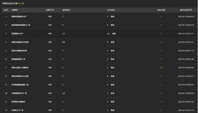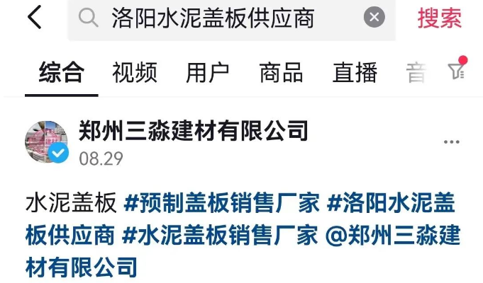 案例展示:鄭州三淼建材,眾多關(guān)鍵詞在抖音搜索中排名首頁。